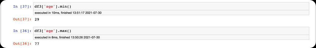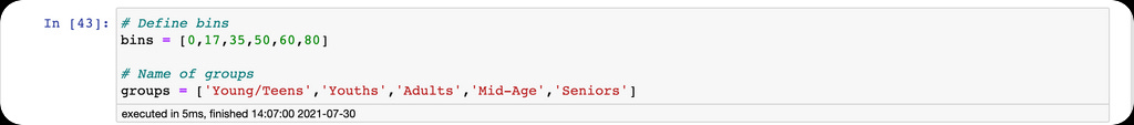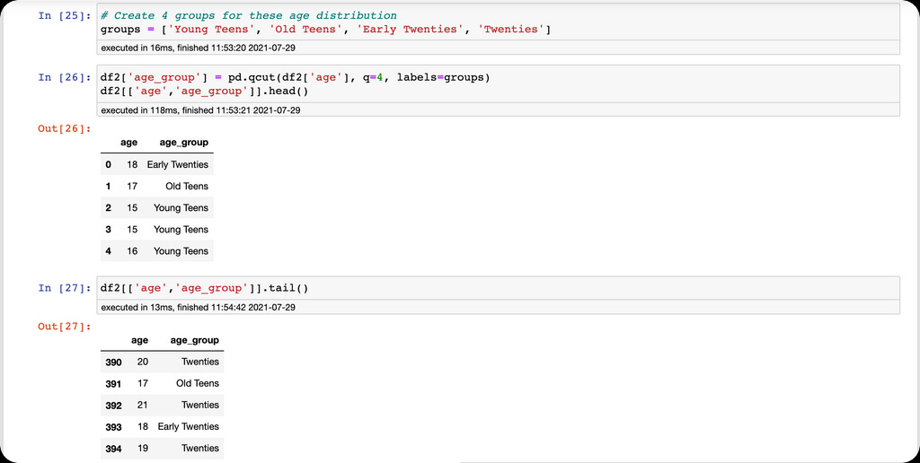 The descriptive statistics show the minimum and maximum values in the age column. This informs our binning intuition. We would create a group with four bins of different age classes, then create a new column with values representing the four bins.