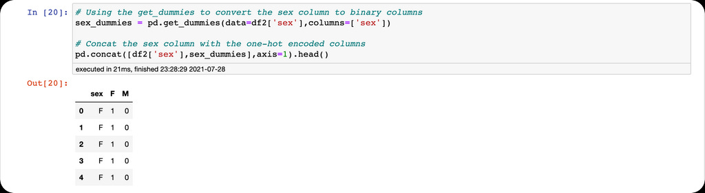 We are going to use the get_dummies function to one-hot encode the sex column into binary columns.