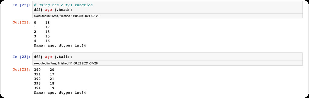 The final feature engineering technique in this article is the Pandas cut function. The cut() function is similar to the qcut() function but with a fundamental tweak. The qcut() function discretizes the continuous variable into four equal bins or quantiles while the cut function doesn't. We just specify the bins and the function makes the split without any guarantees of how the values will be distributed.