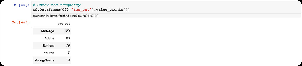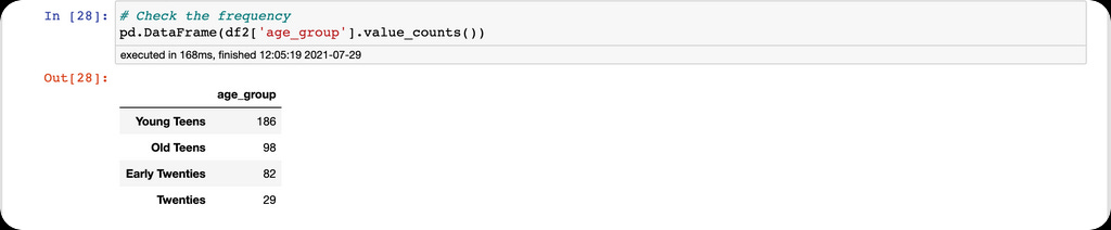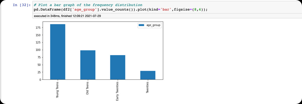 Additionally, we can see the frequency and plot the distribution of the age groups.
