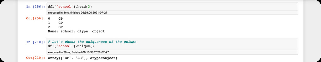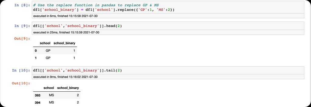 Using the replace function, we replace the categorical values of the school feature with 1 and 2 in the order of importance.