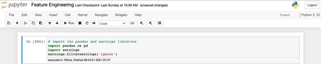 First, we import the Pandas package and the warnings package to silence unnecessary warnings.